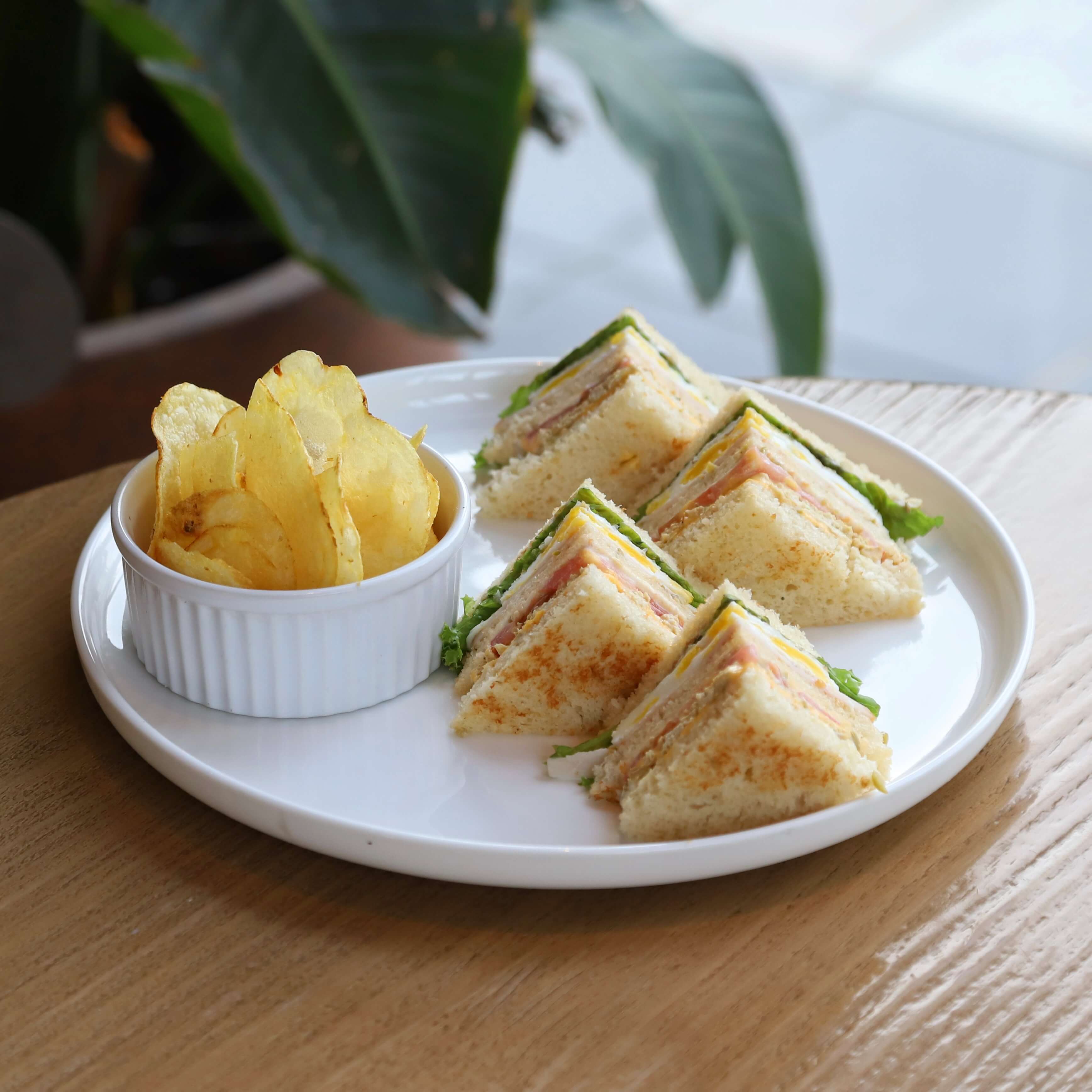 homemade bread layer, with grilled chicken, egg slices, smoke turkey, fresh tomato, crispy lettuce ,and melted cheese. served with golden chips on the side.